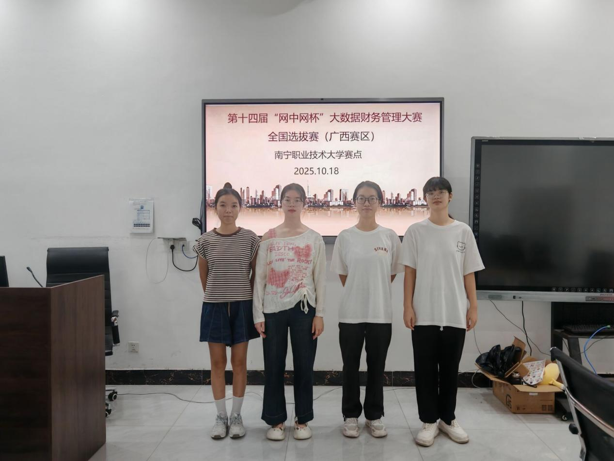10月18日,由中国商业会计学会主办,厦门网中网软件有限公司协办的2025年“网中网杯”高等职业院校大数据财务管理技能大赛全国选拔赛圆满结束,由我校数字经济学院徐扬、杨缘老师指导,大数据与会计专业学生梁家露、唐芙蓉、陈如君、陈芸凤组成的代表队,经过激烈角逐获得了广西团体第一名,取得代表广西参加全国总决赛的资格。