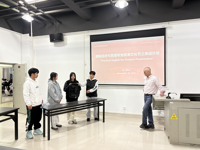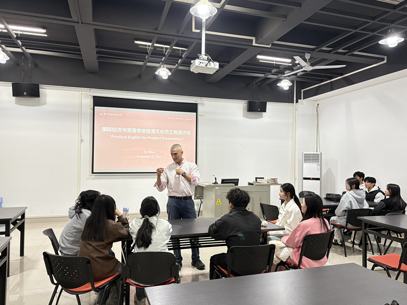 11月21日,国际经济与贸易专业桂港文化节系列活动之“产品推介实用英语”主题沙龙在四训209教室成功举办。本次活动由国际学院外教Michael老师主讲,我院2024级、2025级国贸、会计等专业30名职业本科及专科学生参与。
