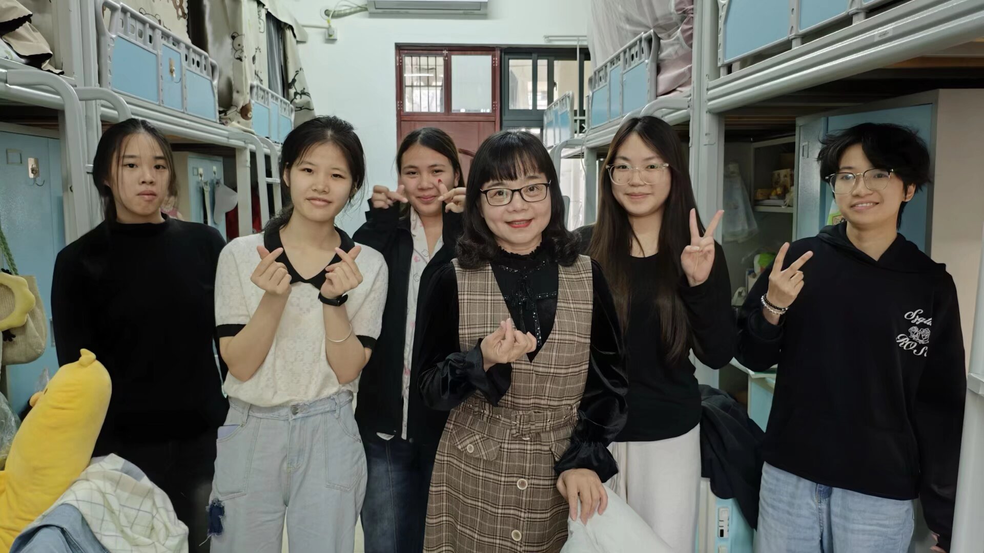数字经济学院书记陈尚玲与同学们在宿舍合影(施季利/摄)