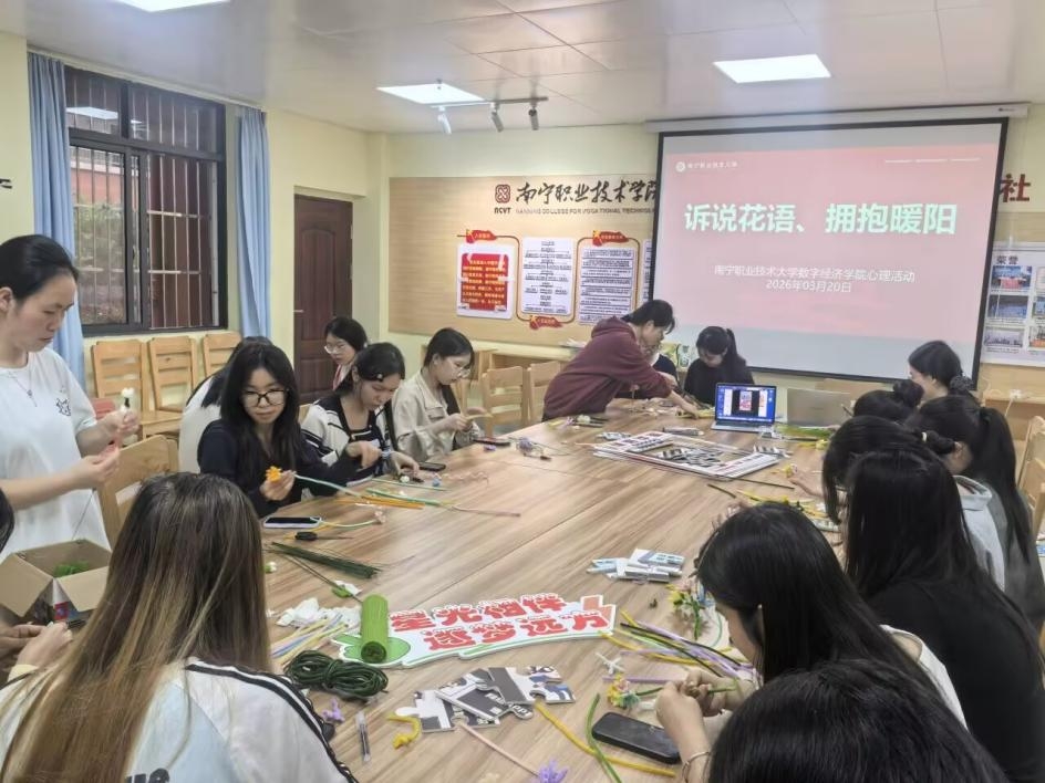 2026年3月20日下午,数字经济学院心理辅导站联合学院团委共同开展“诉说花语,拥抱暖阳”春季学期心理健康活动。活动以插花为载体,引导同学们在指尖花艺创作中陶冶情操、舒缓压力,助力大家调节情绪、拥抱积极心态。