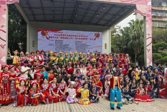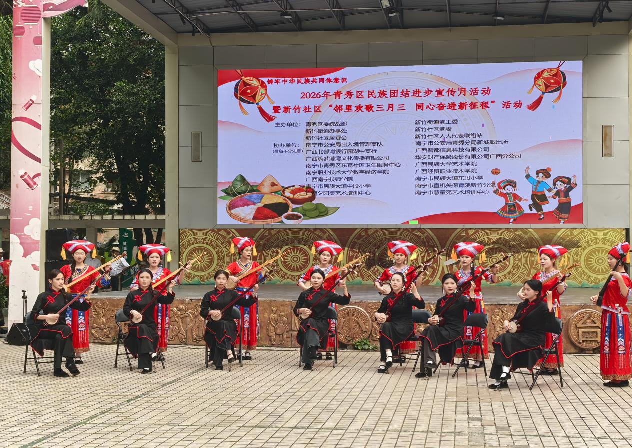 为铸牢中华民族共同体意识,传承弘扬广西优秀民族文化,在 2026 年广西三月三来临之际,我院学生第二党支部师生代表、学院团委工作人员、学院艺术团天琴队队员,走进南宁市青秀区新竹社区,参与“2026 年青秀区民族团结进步宣传月暨‘邻里欢歌三月三,同心奋进新征程’”主题活动,以非遗展演传递民族温情,以文化共建凝聚奋进力量。