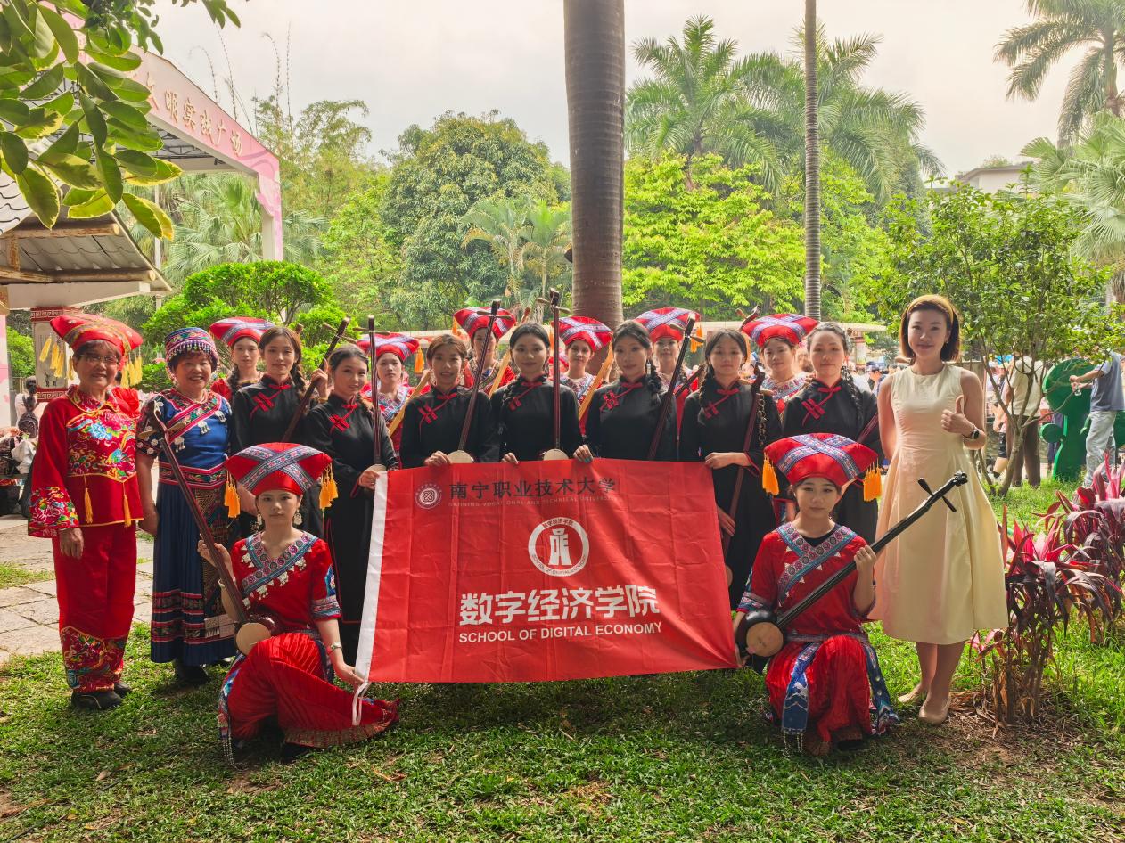 活动现场,学院天琴队的同学们身着民族盛装,以非遗乐器天琴为媒,带来了极具壮乡特色的文艺展演。队员们端坐凝神、指尖轻拨琴弦,悠扬婉转的天琴旋律流淌而出,赢得了现场社区居民的阵阵掌声,现场洋溢着“各民族像石榴籽一样紧紧抱在一起”的浓厚氛围。