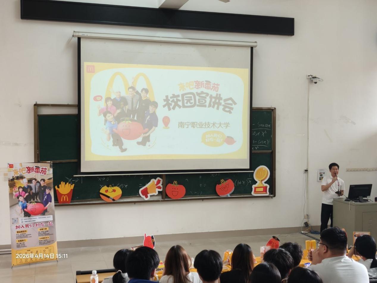 2026年4月14日,市场营销专业与广西禾唛餐饮有限公司(广西麦当劳特许经营商) 正式达成实训项目合作,并举行《创业实训》课程项目宣讲会。广西禾唛餐饮有限公司人力资源中心顾问林振荣、市场营销专业负责人吉思,以及课程实训指导老师、2024级全体同学出席了本次宣讲会。