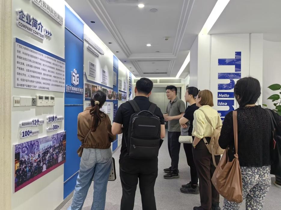 广西巨大教育科技集团是一家集教育产业投资、国际化人才培养、教育科技研发、产教融合创新于一体的跨国教育科技集团,业务覆盖5个国家23个城市。在企业相关负责人陪同下,调研组一行实地参观了企业的教学系统展示区及留学服务中心,详细了解了企业在多语种培训、留学服务、国际中文教育及低空物流无人机等领域的成果。企业近年来深度参与了“中国—越南电子信息现代工匠学院”等项目建设,在服务中资企业“走出去”及本土化人才培养方面积累了丰富经验。来自泰国的留学生郑浩铭表示:“这次参观让我看到了中国教育科技的发展水平,也了解到许多面向东盟国家的留学和培训机会。我希望将来能运用在南宁职业技术大学学到的电商知识,从事中泰之间的跨境电商交流工作。”