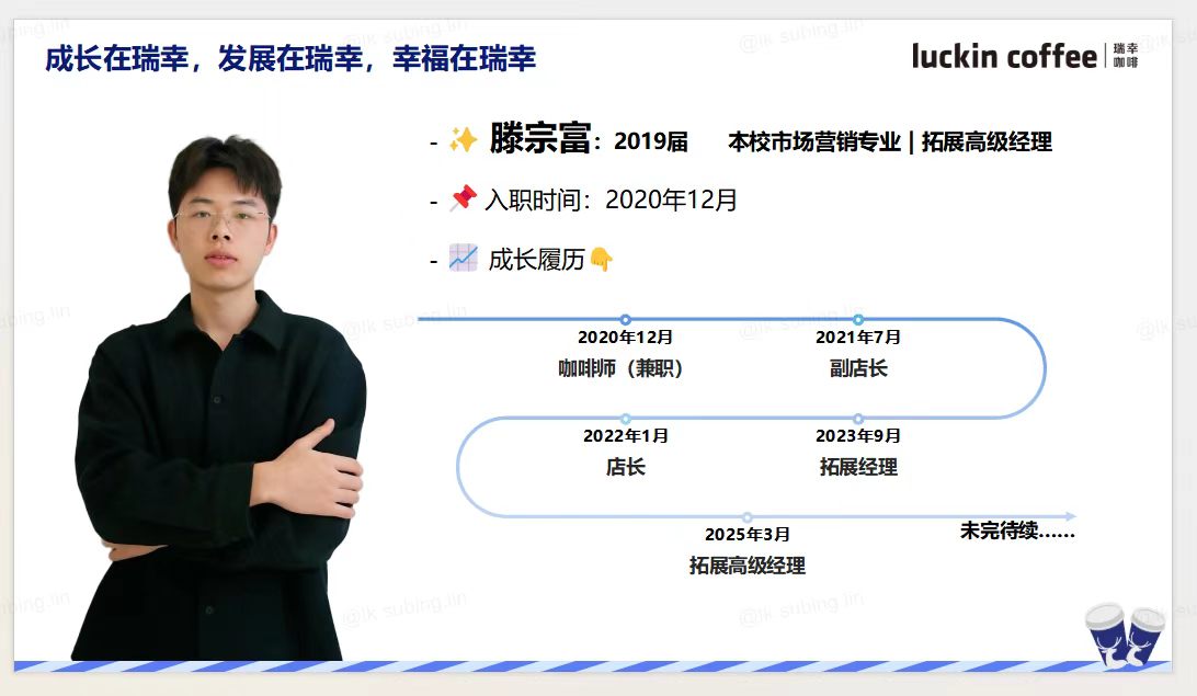 宣讲会上,林竹总监以翔实数据与典型案例,全面介绍企业发展历程、战略布局与市场版图,清晰解读当前及未来人才需求方向。人力资源部HRBP 经理韦彩跳围绕员工成长体系,从职业规划、晋升通道、培养机制等方面,为同学们展示了清晰的职业发展路径。我校2016级(2019届)市场营销专业优秀校友、瑞幸咖啡拓展部高级经理滕宗富,结合自身从业经历,分享了从职场新人到稳步成长的真实故事,传递了脚踏实地、积极进取的职业精神。