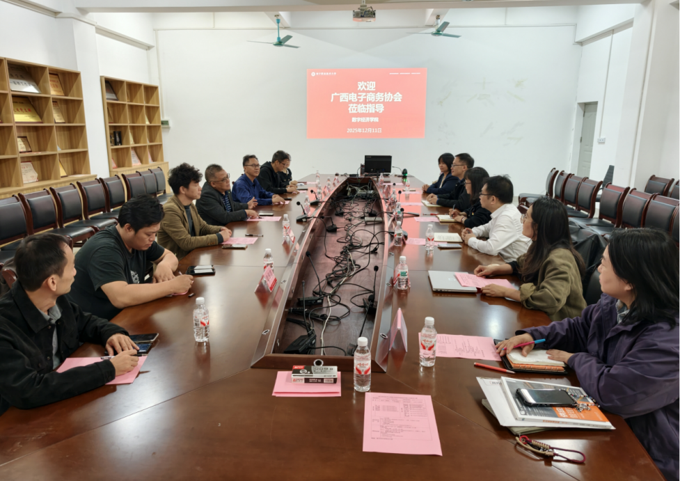 2025年12月11日上午,广西电子商务协会会长杨云率协会秘书长、副会长及会员企业代表一行到访我校数字经济学院,围绕“数字经济 赋能跨境 协同育人”主题开展专项考察与交流活动。数字经济学院党委书记陈尚玲、副院长何海波、副院长李龙及相关专业负责人、教师代表参加接待并开展深入交流。