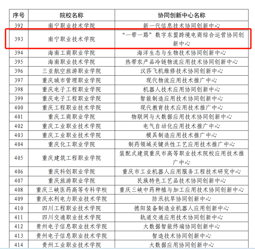 成立背景:在新发展格局下,中国外贸发展面临着新形势,出现了新业态,而跨境电商已成为中国进出口贸易的重要组成部分,其既是实现产业转型升级的重要抓手,也是畅通国内国际双循环的重要引擎。在此背景下,南宁职业技术学院与清华大学、北京中清研信息技术研究院、阿里巴巴等单位合作共建“一带一路”数字东盟跨境电商综合运营协同创新中心,2019年获教育部认定为国家级协同创新中心。